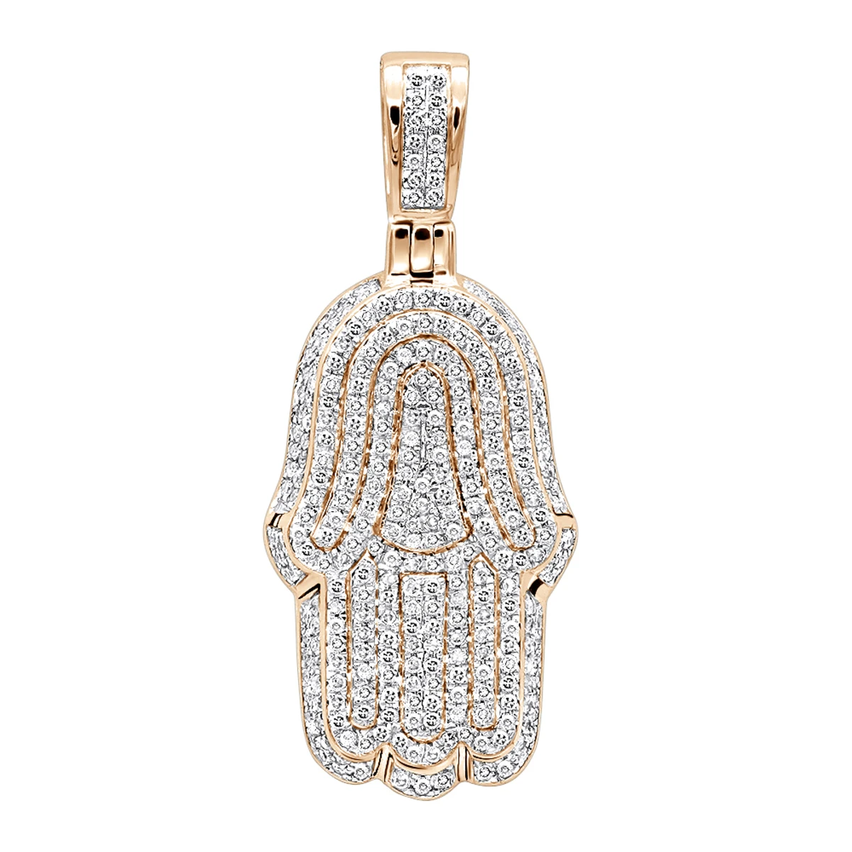 Our Jewish Jewelry Collection: This solid 10k gold Diamond Hamsa Hand Pendant Fully Iced Out Charm by Luxurman features a classic Hamsa hand design fully paved in 1 carat of genuine diamonds; The Hamsa Hand is an ancient Middle Eastern amulet symbolizing the Hand of God. In all faiths it is a protective sign. It brings its owner happiness, luck, health, and good fortune. The hamsa hand has a wide variety of different spellings which includes hamesh, hamsa, chamsa, and khamsa, Hamsa jewelry is a meaningful and wonderful gift for any occasion and this diamond hamsa pendant will make a great housewarming gift, a Bat Mitzvah gift, Hanukkah gift, anniversary or birthday gift. You also can personalize this piece or check we’ve already made and create your own design.