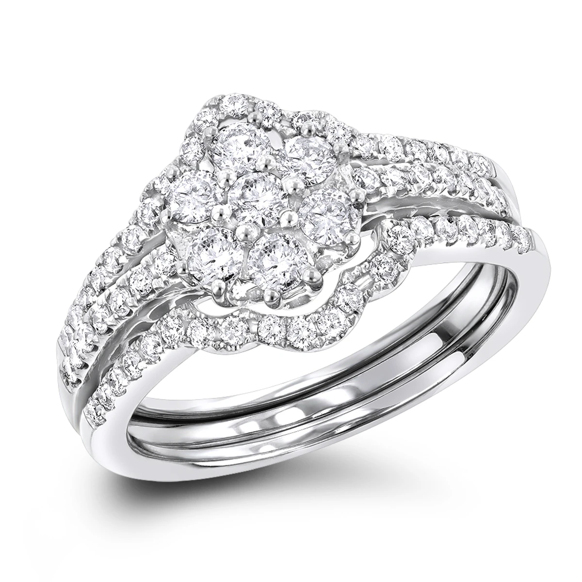 14K White Gold Cluster Diamond Ring Set Trio 1.11ct