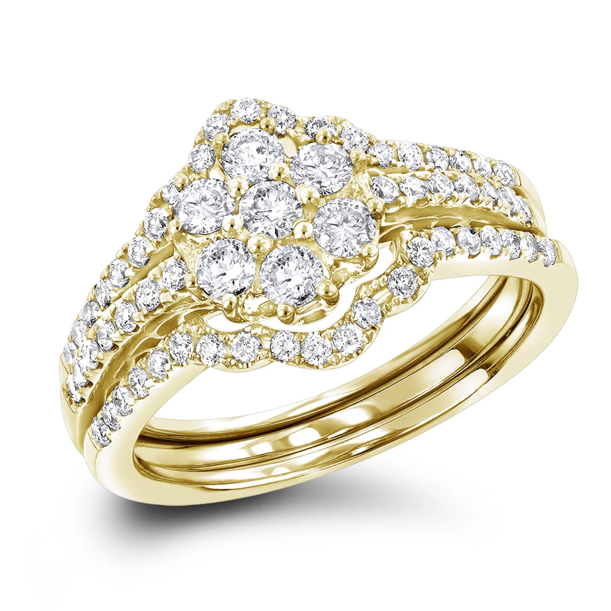 This 14K Gold Cluster Diamond Ring Set Trio showcases 1.11 carats of sparkling round diamonds. Featuring a fabulous design and a highly polished gold finish, this ladies diamond ring set (1 pre-set diamond flower ring and 2 matching diamond bands) makes a unique pre-set diamond engagement ring set and is available in 14K white, yellow and rose gold.