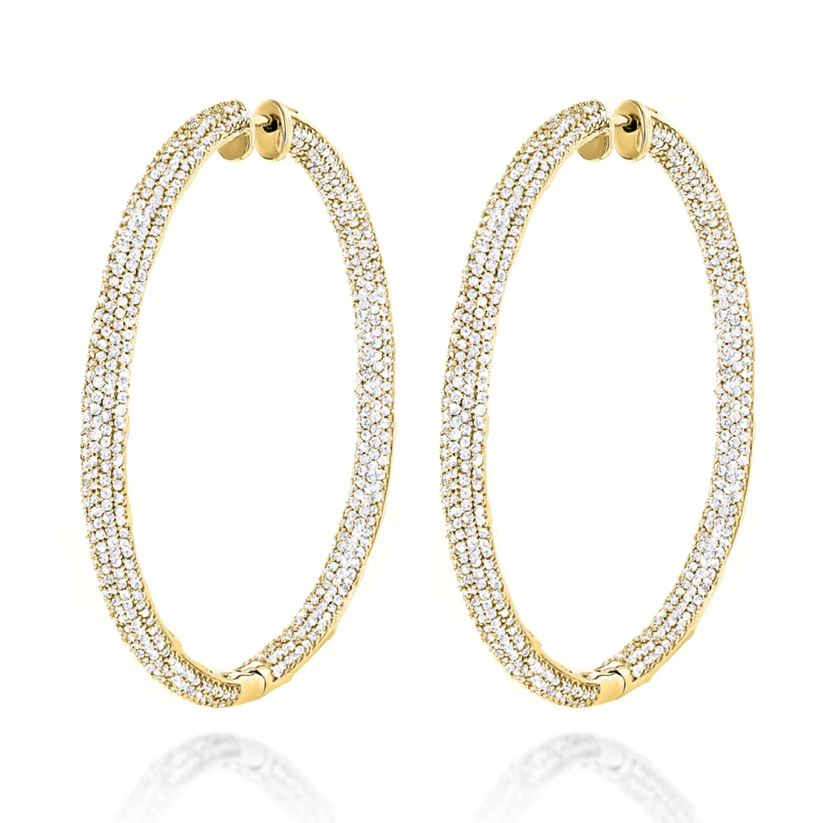 These classic 14K Gold Inside Out Diamond Hoop Earrings weigh approximately 14 grams and showcase 5.40 ctw of sparkling round diamonds, each masterfully pave-set in lustrous gold frames. Featuring a luxurious inside out diamond look and a highly polished gold finish, these exquisite diamond hoop earrings are available in 14K white, yellow and rose gold.