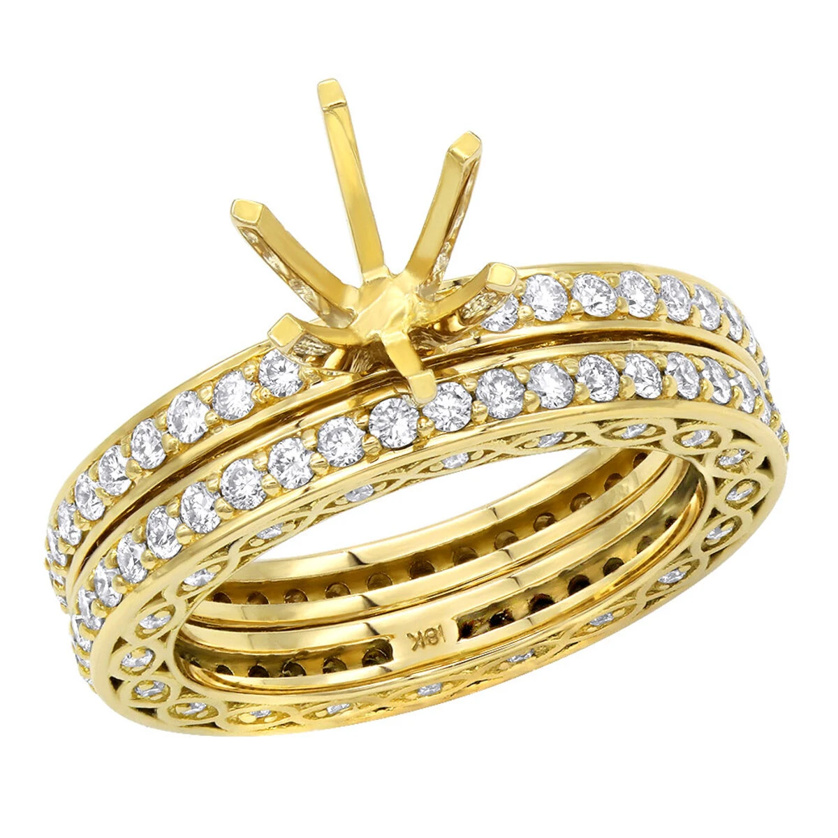 This luxurious 18K Gold Eternity Diamond Engagement Ring Set from our designer diamond bridal collection weighs approximately 7 grams and showcases 1.82 ctw of sparkling round diamonds, each masterfully pave or prong set in lustrous gold frames. Consisting of a beautiful diamond eternity engagement ring setting and a perfectly matching diamond eternity band, this fabulous diamond bridal ring set is available in 18K white, yellow and rose gold.
