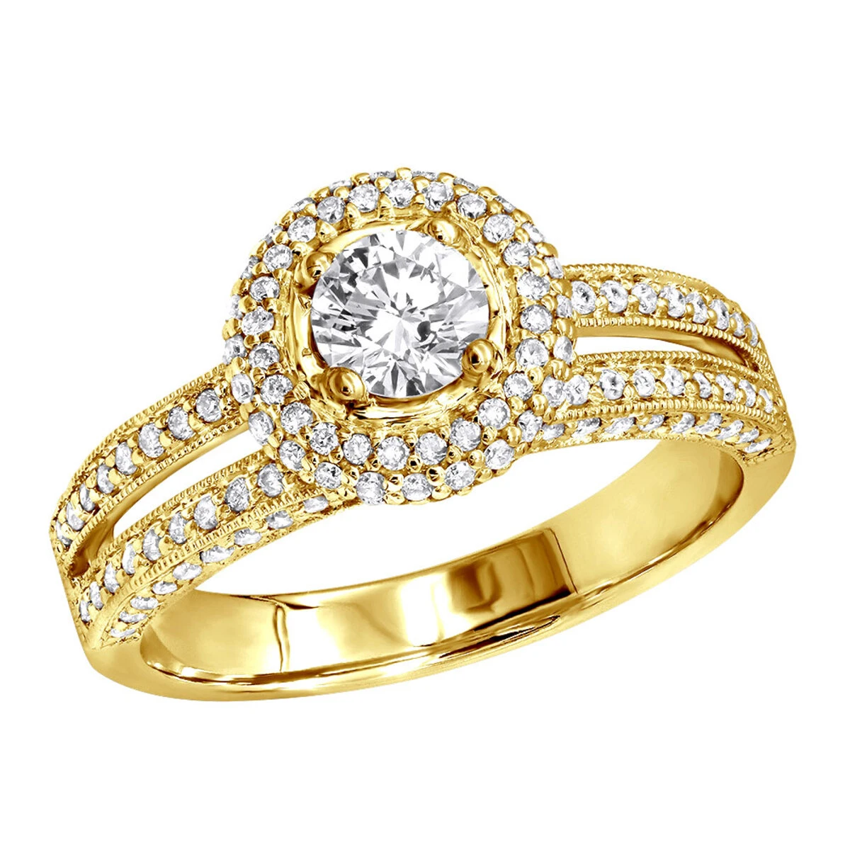 This elegant 18K Gold Round Diamond Engagement Ring with Halo design from by LUXURMAN from our diamond bridal jewelry collection weighs approximately 6 grams and showcases a total of 1.5 carats sparkling round diamonds, center diamond is 1/2 carats set in a secure 4 prong setting in the middle with 1 carat of pave set diamonds in a double halo around the center diamond and diamonds going on sides of the ring. Featuring a fabulous Halo design with smaller round diamonds pave set around the larger center diamond and unique sides separating in 2 lines on each side of the ring and also decorated with round pave set diamonds as well as filigree design on the gold this halo diamond engagement ring is available in 18 Karat white gold, yellow gold and rose gold.