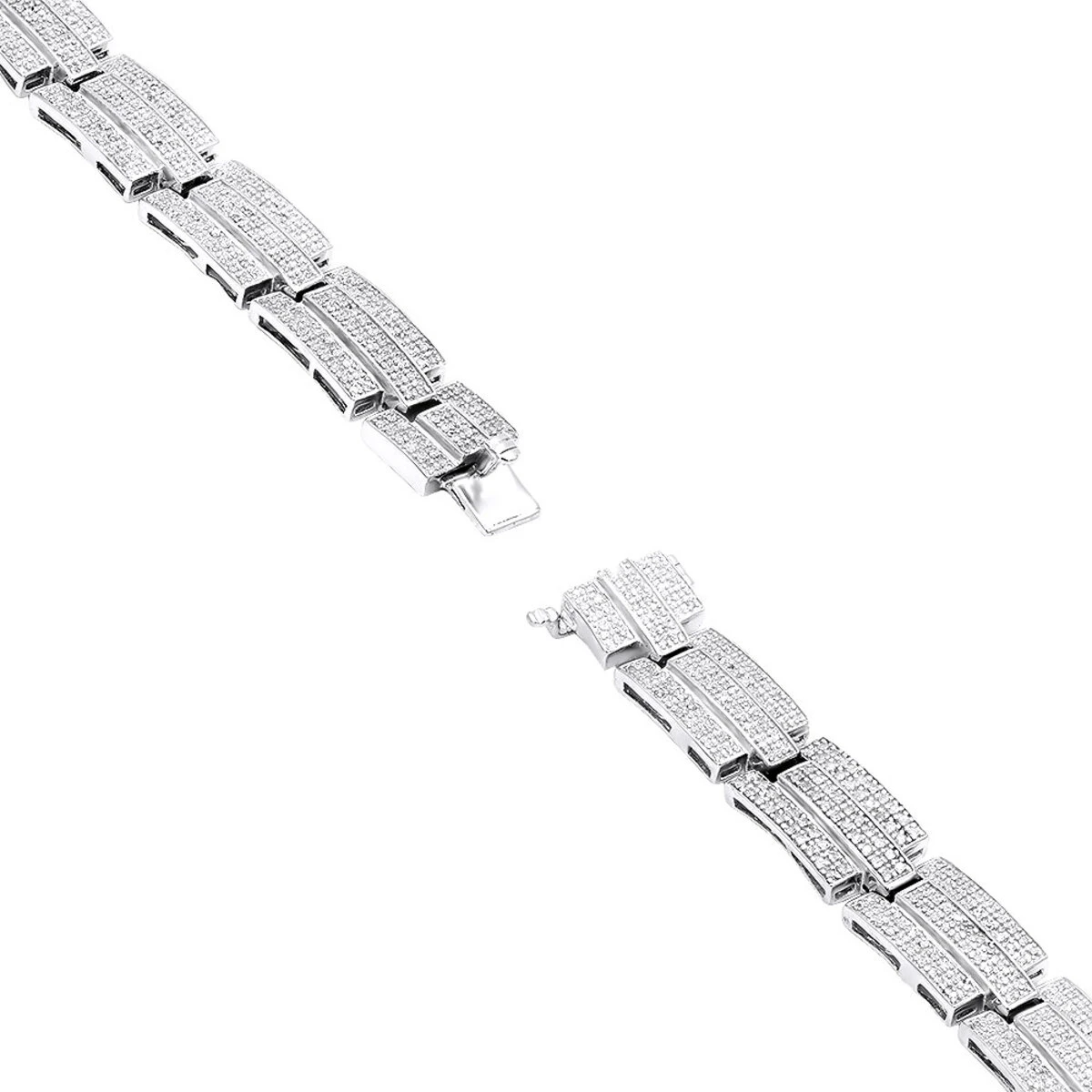 Sterling Silver Jewelry: This Affordable Men’s Diamond Bracelet in sterling silver weighs approximately 43 grams and showcases 3.58 ctw of pave-set round diamonds. Featuring a versatile design, this is a great budget piece featuring polished sterling silver and genuine diamonds. This men’s diamond bracelet is also available in 10K and 14K gold, please contact us for details.