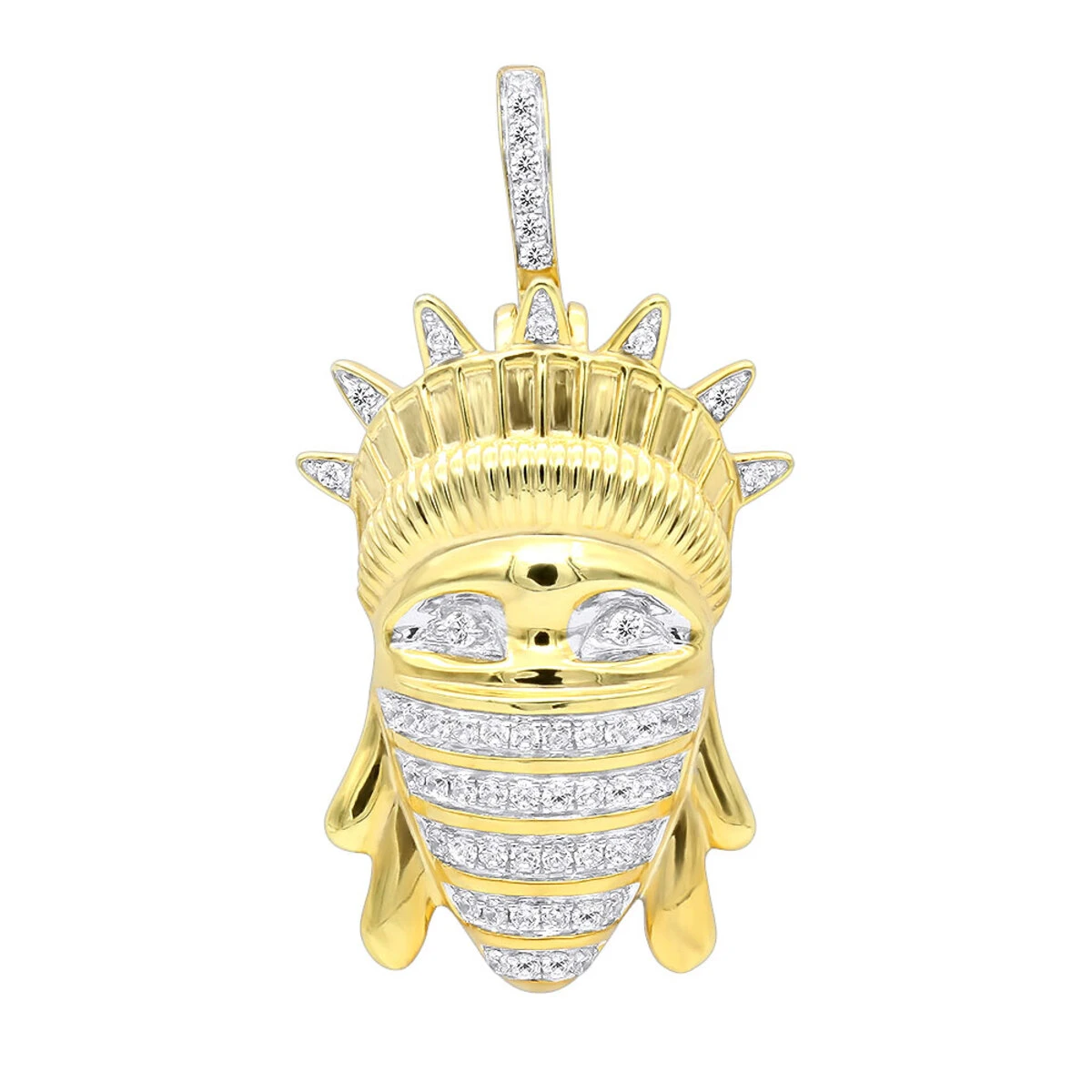 This cool diamond pendant showcases Statue of Liberty head with striped diamond gold bandana covering the face. The pendant is crafted in highly polished precious 10K gold and decorated with radiant sparkling 1/2 carat of real diamonds. This unique pendant represents freedom and individual life style. The pendant is 20mm wide, 38mm long (including the bail) and is available in 10K Yellow, White and Rose Gold. If you are looking for a cool and fancy gift – this Statue of Liberty in Bandana Diamond Pendant would be a great choice! You also can personalize this piece or check we’ve already made and create your own design.