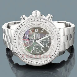 This completely Custom Breitling Super Avenger Men’s Diamond Watch features 5.50 carats of sparkling white diamonds on the bezel of the silver tone stainless steel case and a silver tone stainless steel band. This Breitling diamond watch showcases a chameleon mother of pearl dial with three chronograph subdials, a date display window at the 3 o’clock position, and 2 rows of glistening white stones around it. The case is water-resistant to 100m (330 ft). Please note that diamonds are custom set in this watch and the watch can be further customized with a different face or different color or size diamonds.