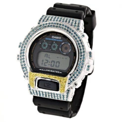 This custom Blue Yellow Diamond G-Shock Watch is based on the original DW6900 Casio model. This diamond watch features 4 carats of sparkling blue and yellow diamonds, a solid sterling silver case, a black rubber band and a digital dial code. A G-Shock Diamond Watch is a stylish addition to any wrist.