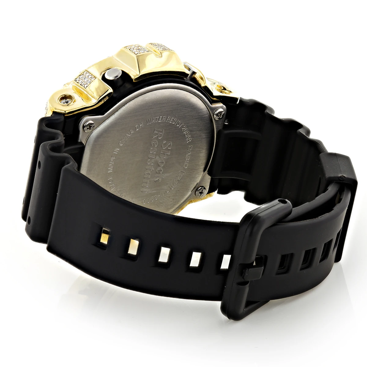 This CUSTOM G-Shock Diamond Watch – Yellow DW-6900 – is based on the original DW6900 Casio watch model. This iced out G-SHOCK watch features 5.25 carats of genuine white diamonds around the bezel, a yellow tone stainless steel case, a black rubber band and a digital dial code. This men’s diamond watch is water-resistant to 200m. A custom G-Shock Diamond Watch is a stylish addition to any wrist.