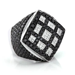 This celebrity 14K Gold White Black Diamond Men’s Massive Ring weighs approximately 39 grams and showcases 8.65 carats of dazzling AAA quality round black diamonds and sparkling G/VS quality princess cut white diamonds, each masterfully set in a lustrous gold frame. Featuring an eye-catching one of a kind design and a highly polished gold finish, this fabulous men’s diamond ring is available in 14K white, yellow and rose gold.