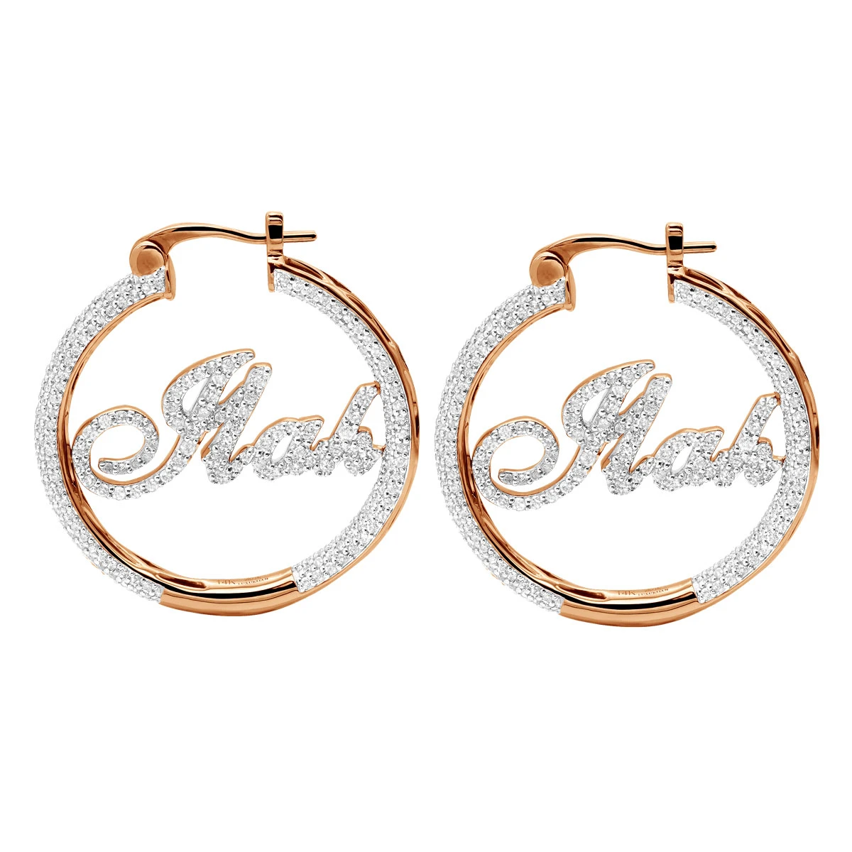 These custom inside out diamond hoop earrings with initials are made in 14k gold and feature a nameplate inside the earrings, the earrings are about 1 1/4in (29mm) long and feature 2.9 carats of genuine diamonds. These diamond hoop earrings are available in 14k white gold, yellow gold, rose gold, as well as 18k gold and Platinum. Contact us to customize them to your specification and your own initials or name plate! Please note: current manufacturing time is 2-3 weeks, so please plan accordingly.
