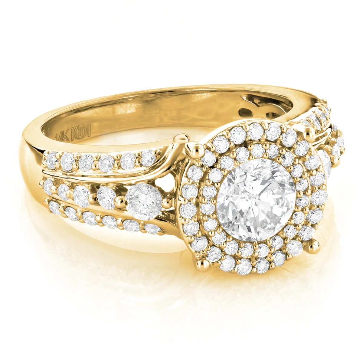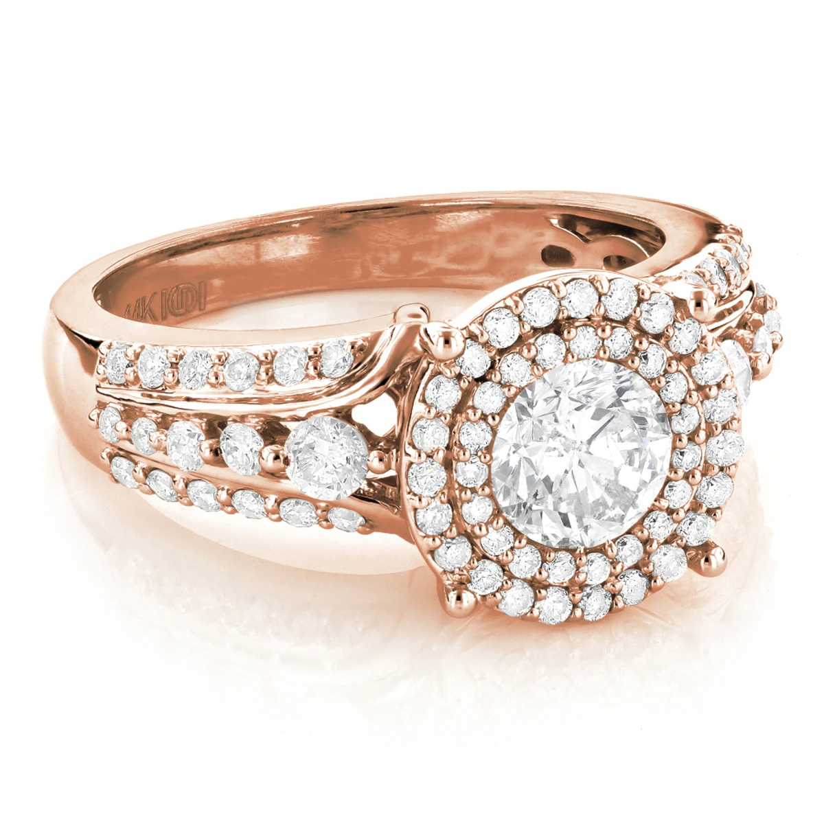 This Double Halo Diamond Engagement Ring in 14K gold showcases a 0.75 carat round diamond in the center and 1 carat of white diamonds on the sides for a total of 1.75 carats of dazzling diamonds; and is available in Platinum, 18k or 14k yellow, rose, white gold, various sizes, and can be customized with any color and quality diamonds. Please contact us at 212-398-3123 if your size or desired option is not listed.