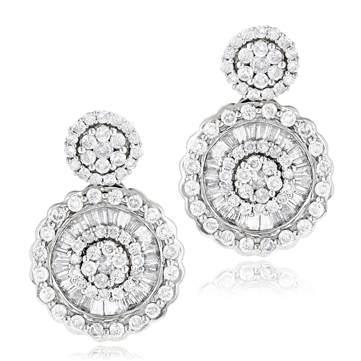 These Ladies 18K Gold Designer Diamond Earrings showcase 1.78 ctw of dazzling round and baguette diamonds, each masterfully set in lustrous 18K gold. Featuring an intricate circle design and a highly polished gold finish, these magnificent diamond earrings are available in 18K white, yellow and rose gold.