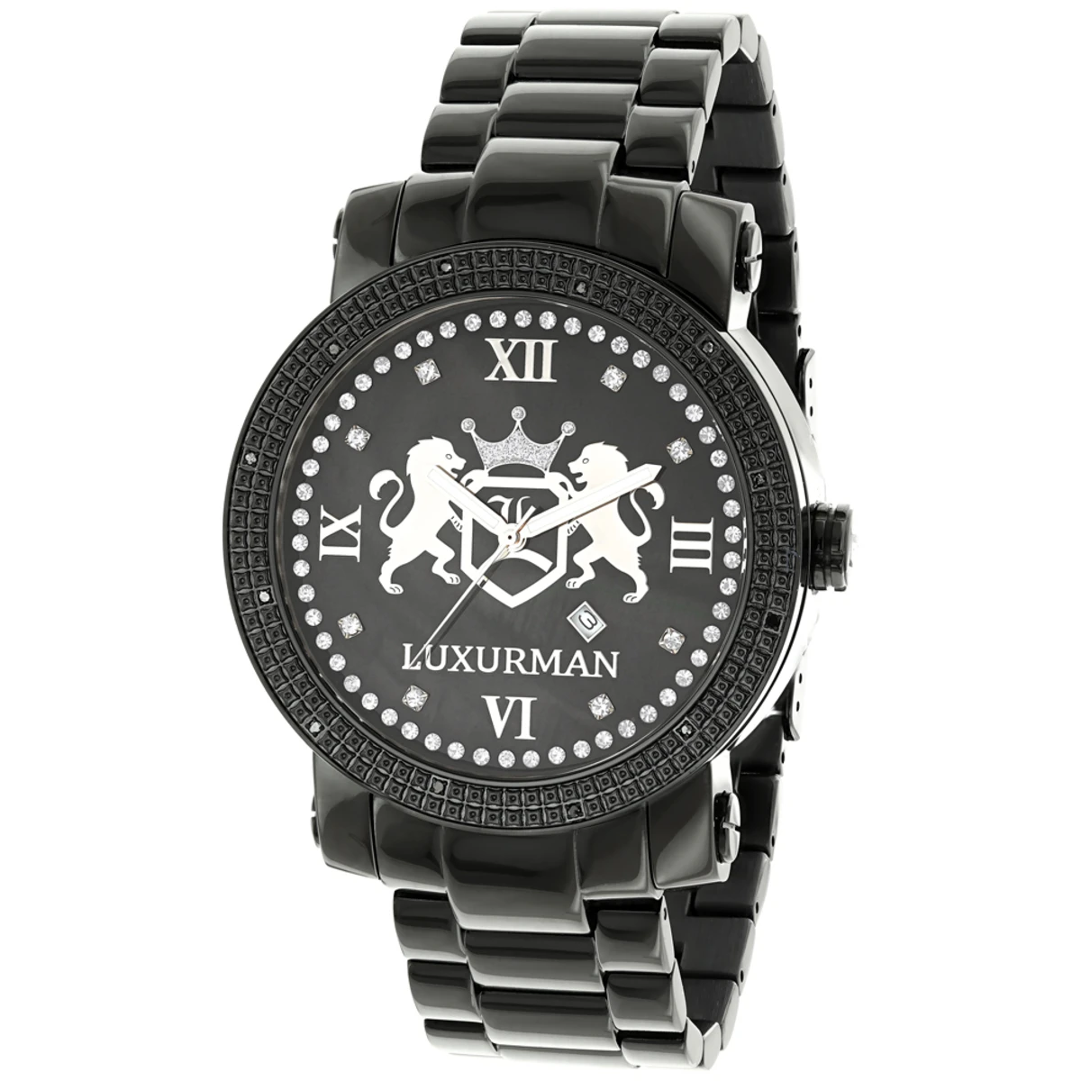 Designer Large Watches: This Luxurman Phantom Black Diamond Watch for Men features 0.12 carats of black diamonds, a black stainless steel case with a stainless steel band, and a black mother of pearl face with distinctive Luxurman Logo. This LUXURMAN men’s diamond watch showcases a fine Japan-made quartz movement and is water-resistant to 30 m (110 ft). Brand new watch, with full manufacturers warranty, retail box and two extra leather bands in different colors.