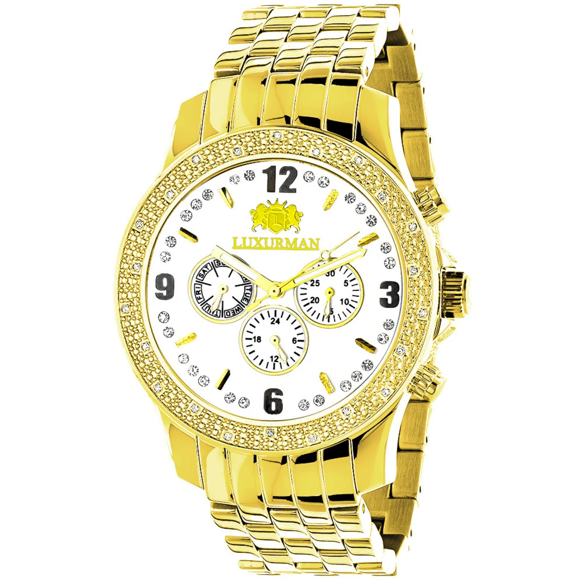 Handsome Luxurman Diamond Watches for Men! This Men’s Diamond Watch by Luxurman showcases 0.25 carats of genuine diamonds on the sides, lugs, bezel and band of a polished yellow gold tone stainless steel case. This Luxurman diamond watch features a beautiful white face with three chronograph subdials and a date display. This men’s diamond wrist watch houses a fine Swiss-made quartz movement, and is conveniently water-resistant to 30 m (110 ft).