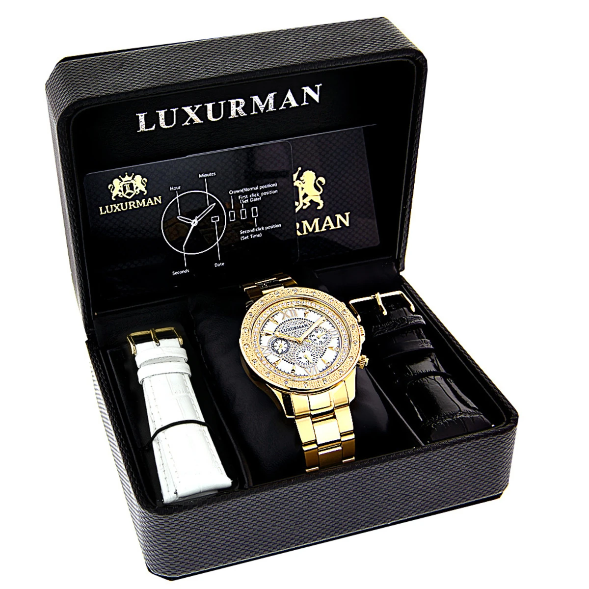 This Luxurman Yellow Gold Tone Men’s Diamond Watch showcases 0.2 carats of genuine diamonds 18k yellow gold plated case and metal band, and white mother of pearl face with three subdials. This luxurious men’s diamond watch by Luxurman houses a fine Swiss-made quartz movement and comes with two extra interchangeable leather straps in different colors (band colors may vary).