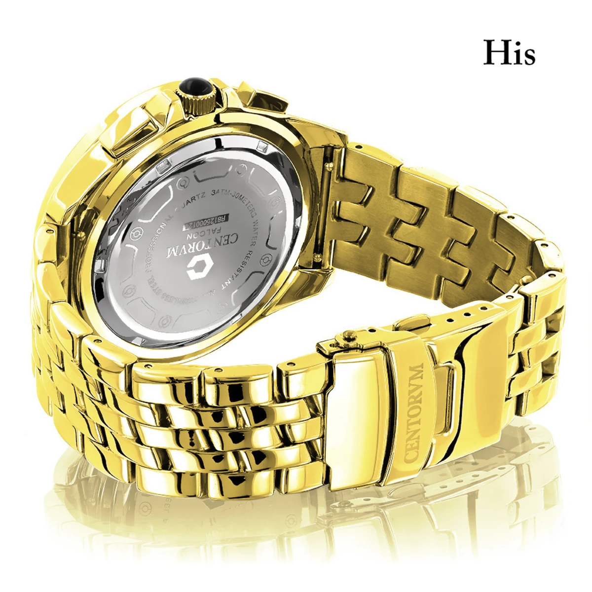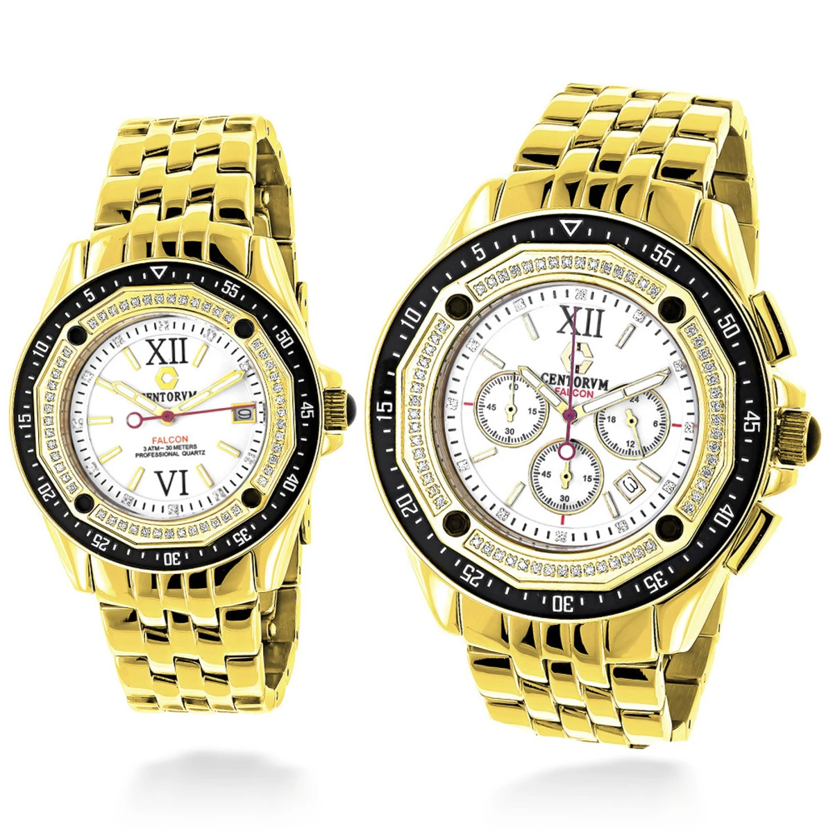 Matching His and Hers Watches: This 18kYellow Gold Plated Diamond Watch Set by Centorum includes these two matching diamond watches for him and her paved with 1.05 carats of genuine diamonds. Both of these Centorum diamond watches are conveniently water-resistant to 30m (100ft) and come with a 1 year manufacturer’s warranty. The Diamond Watch for Her features 0.5 carats of genuine diamonds, white dial with shiny stones marking hours, has Quartz movement and a date display window at a 3 o’clock position. The Diamond Watch for Him is paved with 0.55 carats of genuine diamonds, features white face with three white Mother of Pearl chronograph sub dials, and a date display window at a 4 o’clock position. This Watch Set is ready for a gift giving.