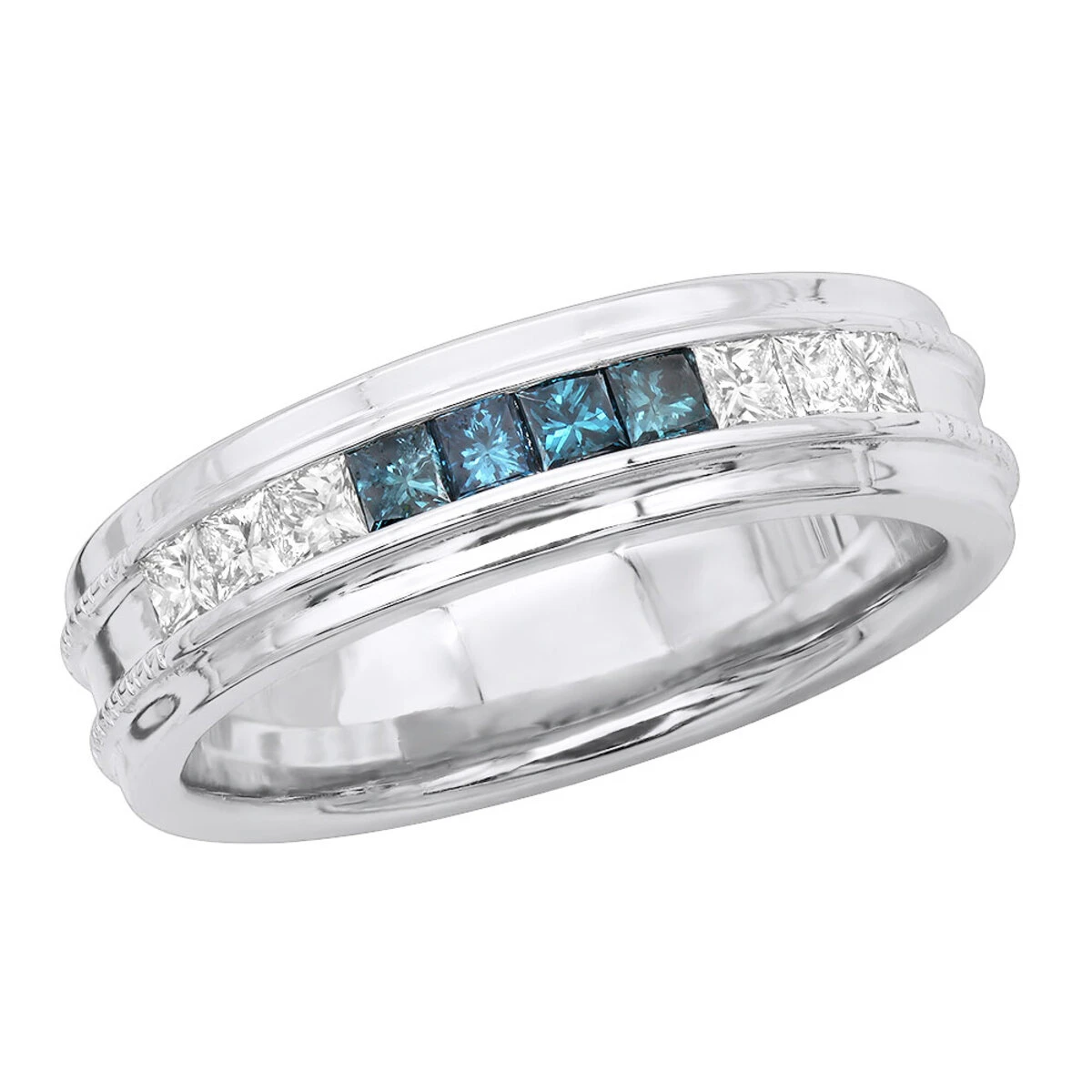 This exquisite Men’s 14K Gold White Blue Diamond Wedding Band from our men’s diamond jewelry collection showcases 0.98 ctw of sparkling princess cut diamonds, each masterfully channel set in a lustrous gold frame. Featuring a simple yet luxurious design and a highly polished gold finish, this one of a kind men’s diamond wedding ring is available in your choice of 14K white, yellow and rose gold, and can be manufactured on per order basis with a combination of any fancy color diamonds (canary yellow, fancy blue, black, chocolate, pink, green, red, and cognac diamonds).