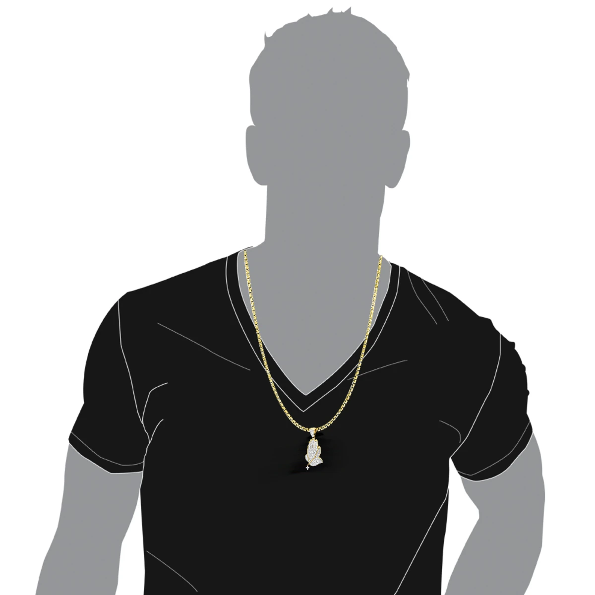 This exquisite 14K Gold Diamond Praying Hands Pendant With Cross by Luxurman features a uniquely designed praying hands pendant fully iced out with genuine diamonds and a hanging from a rosary cross; this men’s diamond pendant weights approximately 7 grams and showcases 0.9 carats of shining round diamonds, each masterfully pave set in a highly polished gold frame. Presenting a one of a kind design, this unique praying hands iced out diamond pendant is available in 14K white, yellow and rose gold. You also can personalize this piece or check we’ve already made and create your own design.