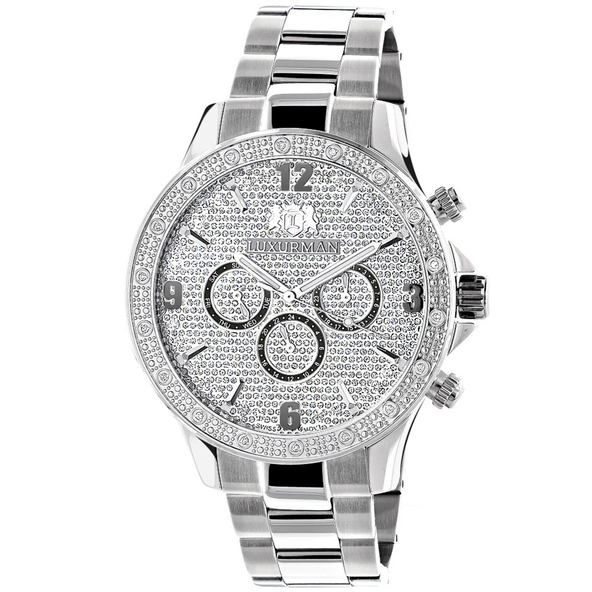 Men’s Diamond Watches collection: This Designer Men’s Diamond Luxurman Midsize Watch – New Arrival – features 0.20 carats of sparkling diamonds on the bezel of the silver tone stainless steel case. This Luxurman diamond watch showcases a dial with Date/Calendar/24 hours subdials paved in sparkling stones, and a silver tone stainless steel band. This men’s diamond watch by Luxurman comes with two extra interchangeable straps in different colors. This Luxurman Diamond watch makes a perfect present for any occasion.