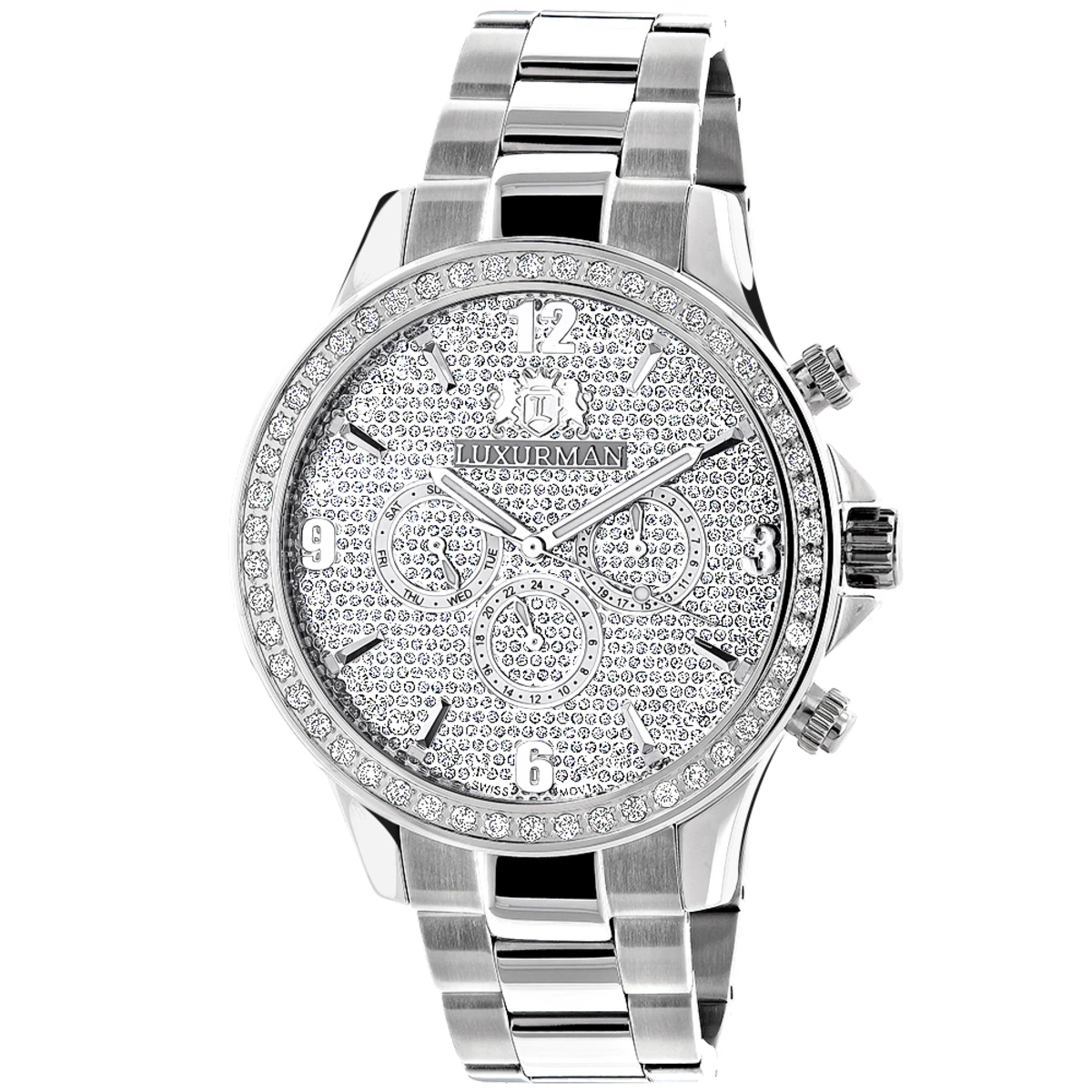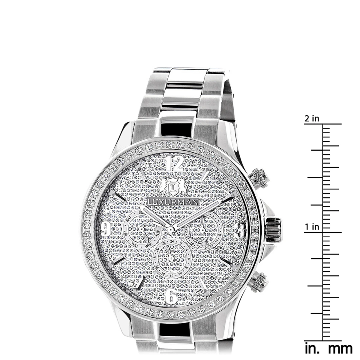 Men’s Luxurman Watches: This Large Diamond Bezel Watch features Swiss Movement and 2 carats of sparkling round diamonds. This Luxurman diamond watch showcases a dial with Date/Calendar/24 hours subdials paved in sparkling stones, and a silver tone stainless steel case and band. This men’s diamond watch by Luxurman comes with two interchangeable straps in different colors and a top industry warranty of 5 years. This Luxurman Diamond watch makes a perfect gift for any occasion.