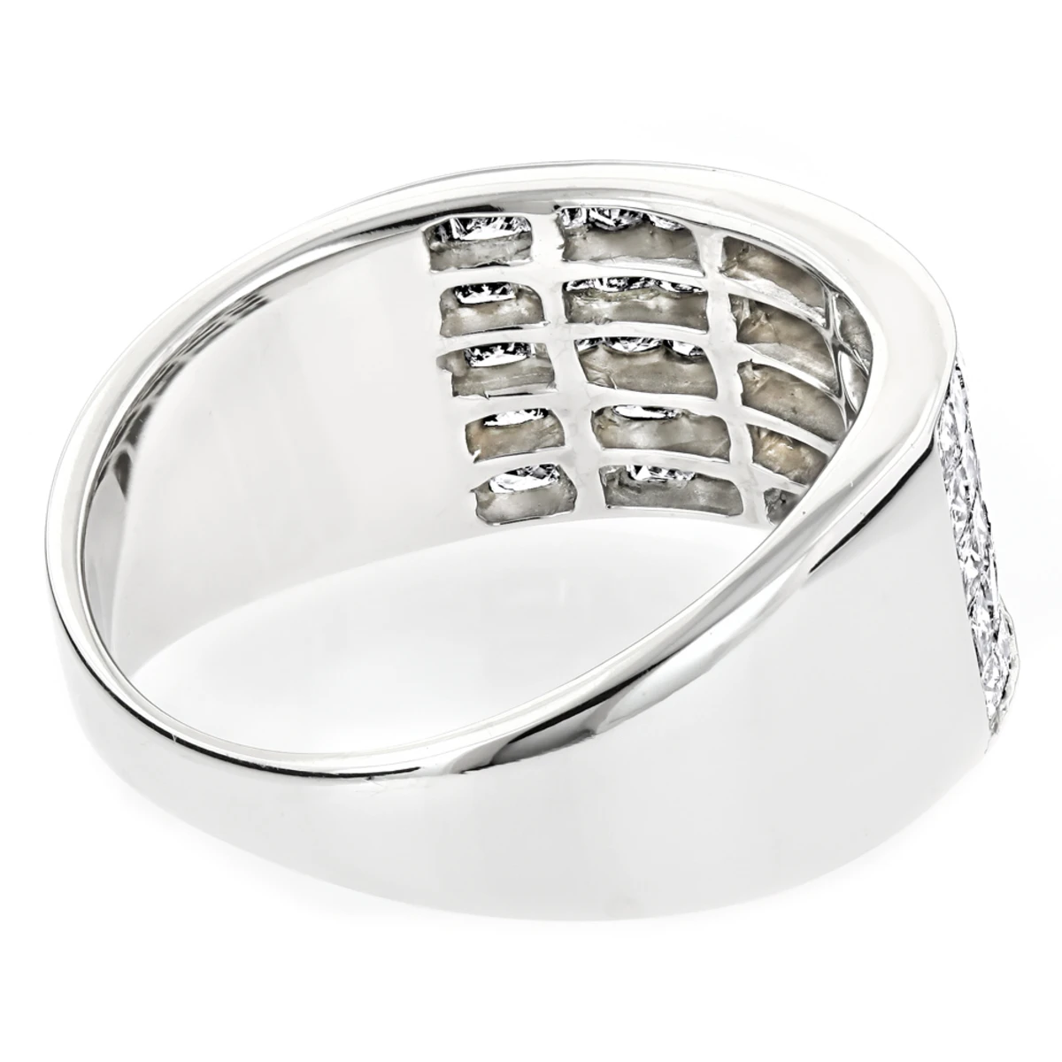 This Men’s Wide Wedding Band with Princess Cut Diamonds in 14K gold showcases 2.11 carats of invisibly-set diamonds and is available in 14K white, yellow and rose gold.