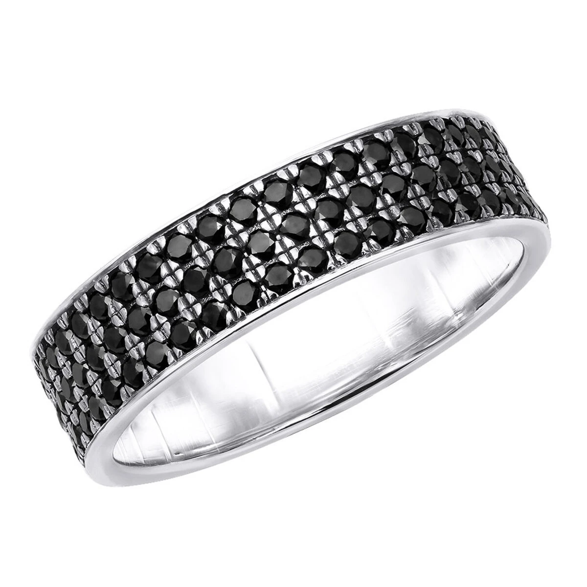 From our diamond wedding and anniversary rings collection: This splendid Black Diamond 3 Row Eternity Band For Men and Women in platinum is manufactured in platinum and is decorated with 2.85 carats of high-quality prong set black round diamonds set in 3 rows along the entire ring. With an option of a full black look with black rhodium plating, this eternity band can become a unique and unforgettable present and a fine addition to one’s jewelry collection. This unique-looking ring is 1/4 in (6mm) features a unisex design and can be worn by both men and women, available in platinum and various sizes.