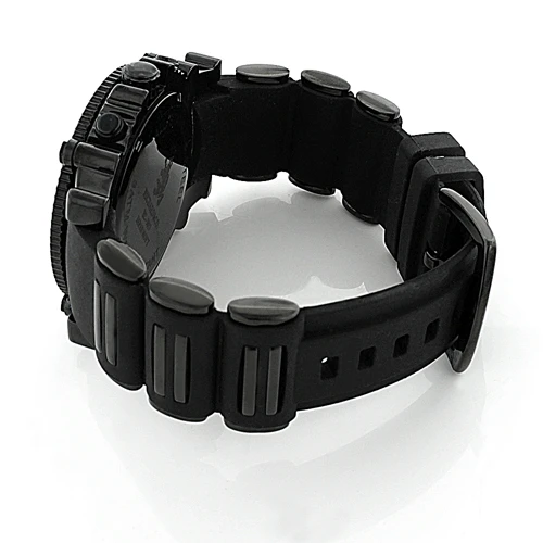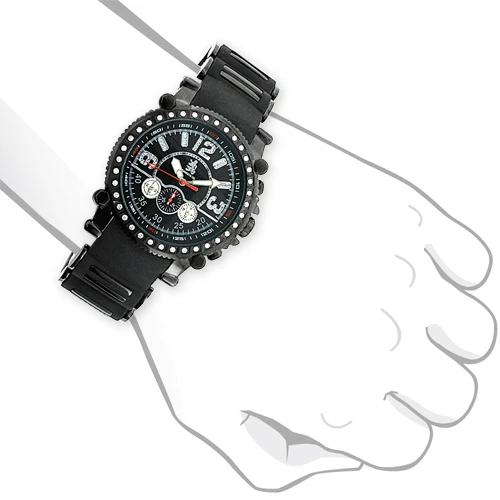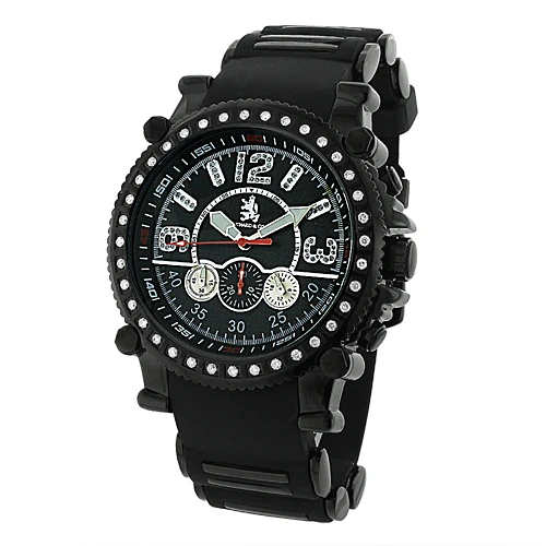 This Richard & Co Men’s Diamond Black Watch features a black tone stainless steel case with 1.0 full carat of white diamonds set around the bezel, a soft rubber strap with black tone stainless steel links; a black face with three chronograph subdials and a fine Japan-made Quartz Movement. This diamond watch is water-resistant up to 30 meters.