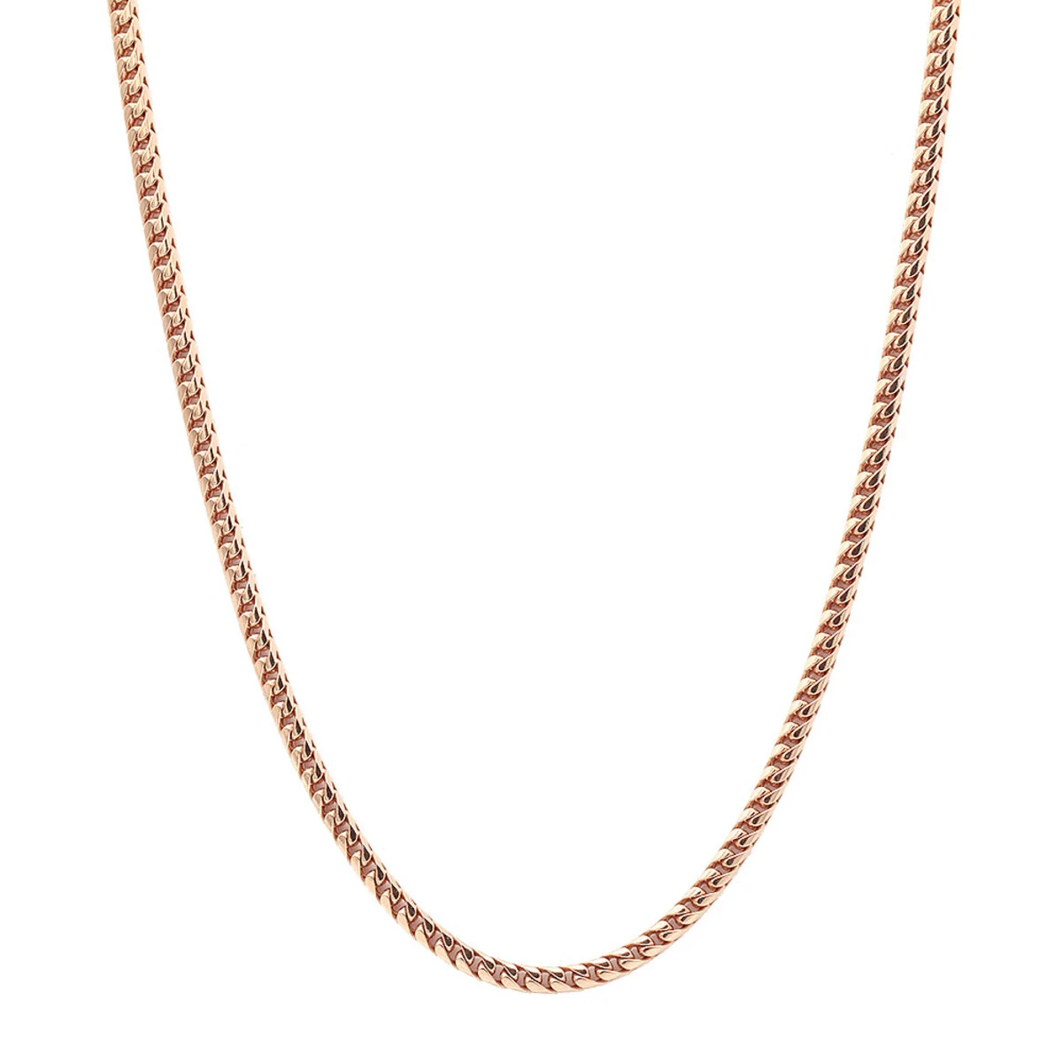 This 14K solid gold Franco chain necklace for men with a lobster claw lock is a squared off chain and weaved together for a very rich look. It takes the top of the line craftsman to make this men’s gold chain, where each individual facet is welded in a perfect fit for excellent movement and flexibility. This gold Franco necklace will not kink and you can even roll it around your finger! It is a polished type chain, yet it catches the light with your every move and is extremely durable in the 14K gold. This chain is 3.5mm wide and can be selection in options from 20 inches (approximately 39 grams) 32 inches (approximately 62 grams) long.