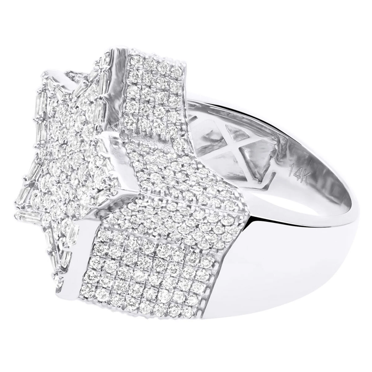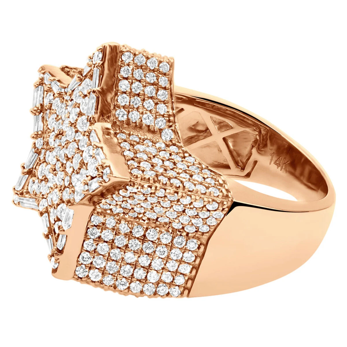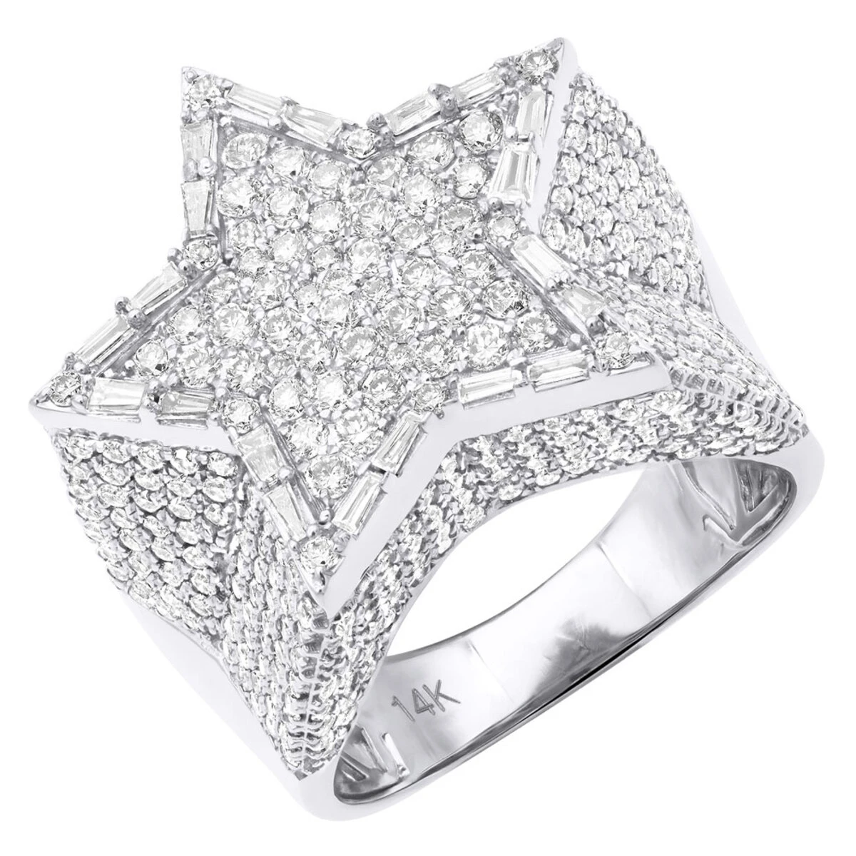 From our men’s diamond rings collection This superb real diamond start ring is a solid 14k Gold Five Pointed Star ring with Baguette and Round Cut Diamonds will make a great pinky ring for men or can be a real statement ring. Blending striking voluminous shape with distinctive use of diamonds on top and sides this ring rivals the shine of a whole starry sky! The key feature that makes this ring stand out among the rest even more is the baguette cut diamond outlining. This diamond star ring is 7/8in (22mm) wide and weighs approximately 14 grams. It will catch the light with your every move and can be ordered in 14K white, yellow or rose gold.