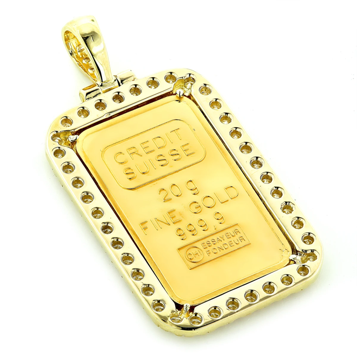 This Statue Of Liberty Diamond Pendant 2.2ct Credit Suisse Gold Bar Charm will make you look fabulous no matter where you are. This magnificent Credit Suisse Gold Bar diamond pendant weighs approximately 30 grams (about 20 grams of 24k and 10 grams of 14k gold) and is decorated with over 2 carats of stunning round diamonds. This custom made diamond pendant will make a luxurious present for that special someone. A chain for this diamond pendant must be purchased separately. Please note that due to scarce gold supply at this time Statue of Liberty Suisse Bar might not be available in which case same weight/value PAMP Suisse Lady Fortuna Bar will be offered instead. You also can personalize this piece or check we’ve already made and create your own design.