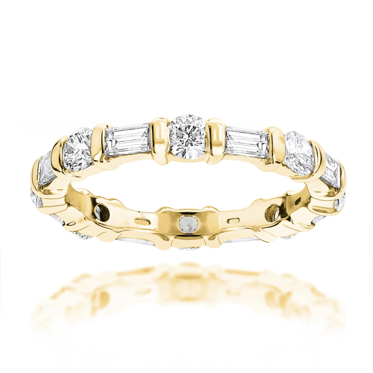 This luxurious 18K gold eternity band with round and baguette diamonds is 3mm wide and features 2.05 carats of sparkling diamonds. This baguette and round cut diamond eternity ring is available in 18K white, yellow and rose gold. Also available in platinum (please contact us for pricing details).