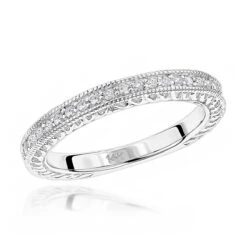 Antique Style Diamond Wedding Bands for Women by Luxurman collection: This Thin 14K Designer Diamond Wedding Band for Women features a unique antique style design with filigree setting and unique decoration on the sides of the band. Filigree (also less commonly spelled filagree, and formerly written filigrann or filigrene) is a delicate kind of jewellery metalwork, usually of gold and silver, made with tiny beads soldered together or to the surface of an object of the same metal and arranged in artistic motifs and was very popular in Italian, French and Portuguese metalwork from 1660 to the late 19th century. This very unique ladies diamond wedding ring showcases 0.19 carats of dazzling round diamonds and is available 14k yellow gold, rose gold, white gold, as well as 18k gold and Platinum as a custom order. Please contact us if you would like to customize it. A matching antique style diamond engagement ring is available below.