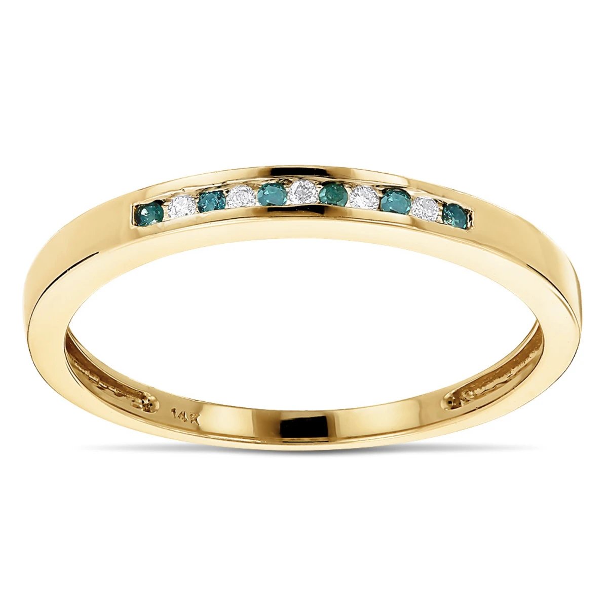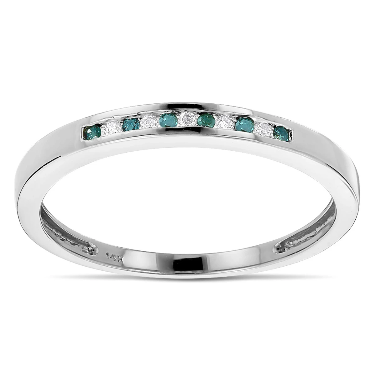 Stackable Rings: This 14K Gold White Blue Diamond Band for Women showcases 0.12 carats of alternating white and fancy blue diamonds, each channel-set in a lustrous gold frame. Featuring an elegant design and a highly polished gold finish, this ladies diamond ring makes a unique diamond wedding band, and is available in 14K white gold, yellow gold and rose gold.