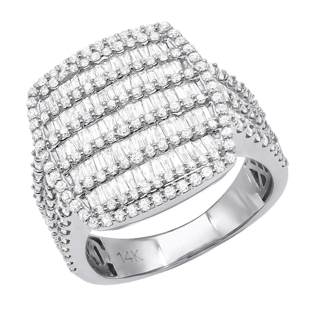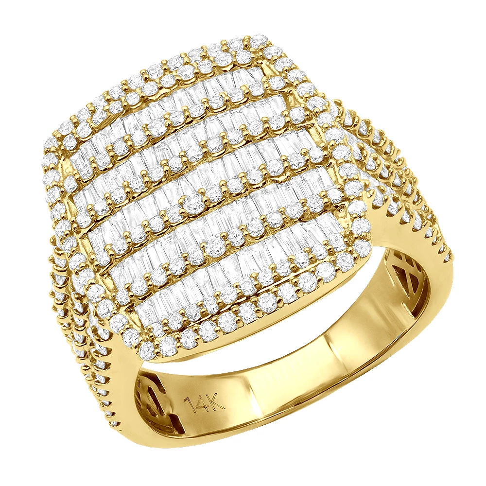 Presenting a very unique men’s diamond ring! Make a bold statement with this 14K Gold 4 Carat Diamond Ring For Men from our Statement and Pinky Rings Collection. A scintillating wide band encrusted with round and baguette cut diamonds gracefully cradles an exquisitely proportioned analogously encrusted top part. Building a distinctive element of design, this diamond ring is 13/16in (20mm) wide and can also come to be a great pinky ring. This ring weighs approximately 10 grams, available in 14K white, yellow or rose gold.
