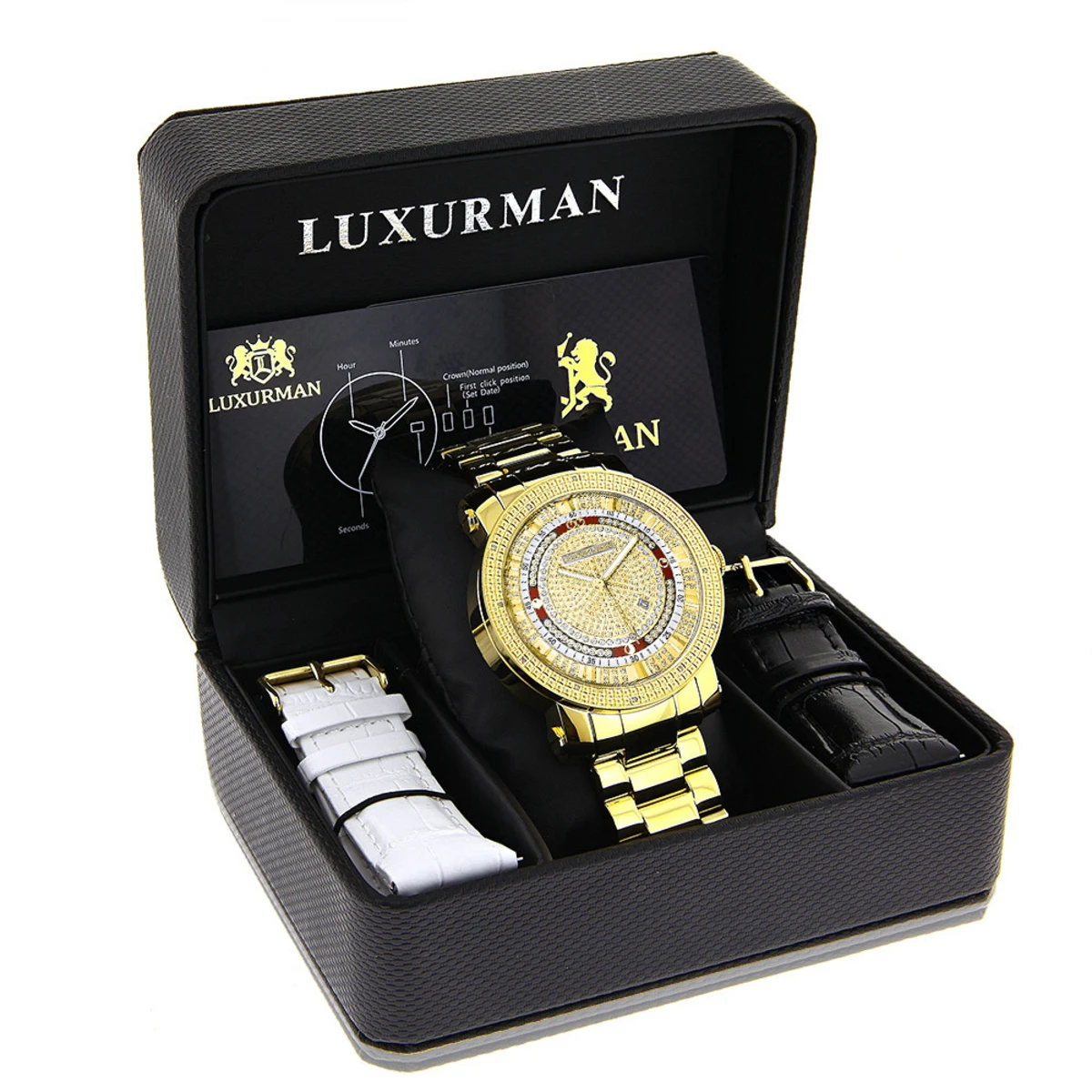 This Unique Large Men’s Diamond Watch by Luxurman features 0.12 carats of genuine diamonds and 18k yellow gold plated stainless steel case and band. The face of this LUXURMAN Diamond Watch for men is paved in white sparkling stones and has a date display at 4 o’clock. This men’s diamond watch by LUXURMAN is water-resistant to 30m (100ft), and makes a great gift for any occasion. Brand new watch with full manufacturer’s warranty, retail packaging and two extra leather bands in different colors.