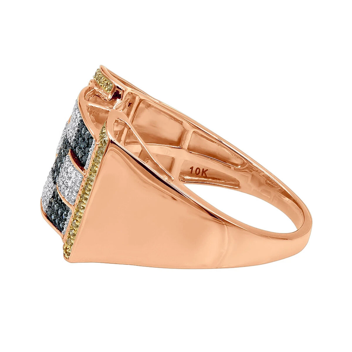 This Unique White Blue Yellow Diamond Ring for Men showcases 0.97 carats of genuine diamonds of different colors and a luxurious rhodium plating for extra shine. This multi-color men’s diamond ring is available is 10K white, yellow and rose gold, just choose your size.