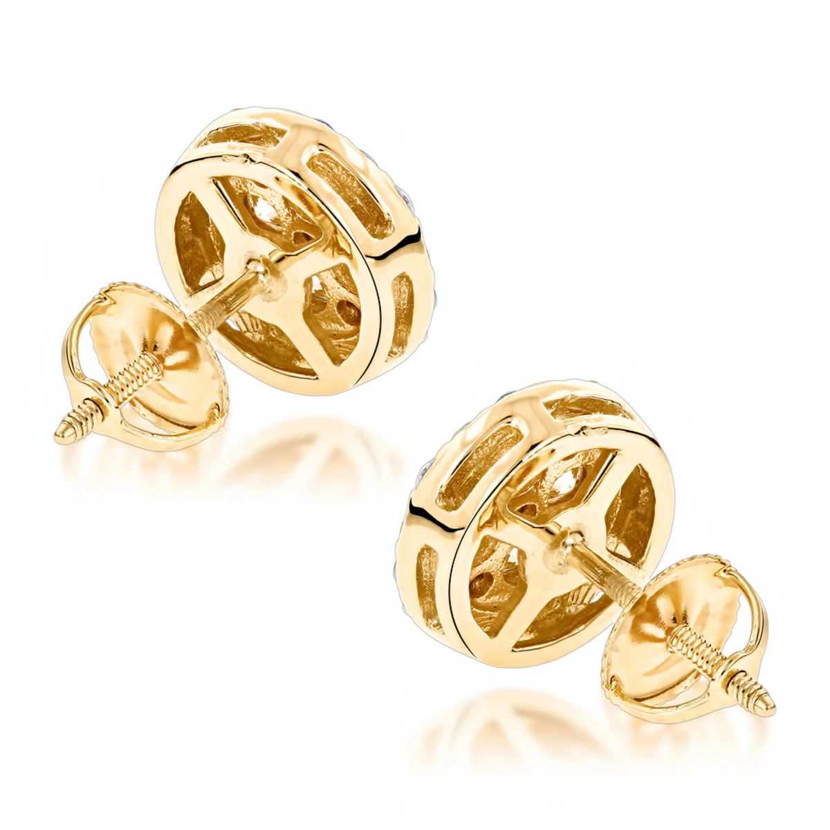 These Unisex Round Diamond Stud Earrings Clusters in 14K Gold showcase 1.75 carats of genuine round diamonds; these diamond studs are available in 14K white gold, yellow gold and rose gold, can be customized with any color and quality diamonds. Matching ladies diamond pendant is available below. Please contact us at 212-398-3123 if desired option is not listed.