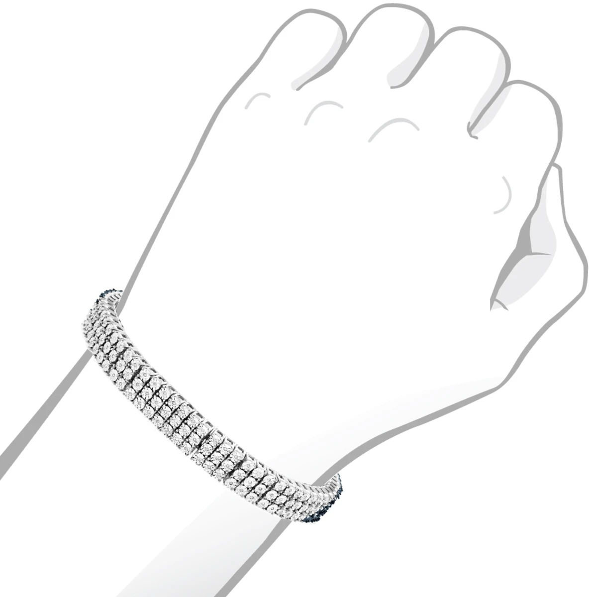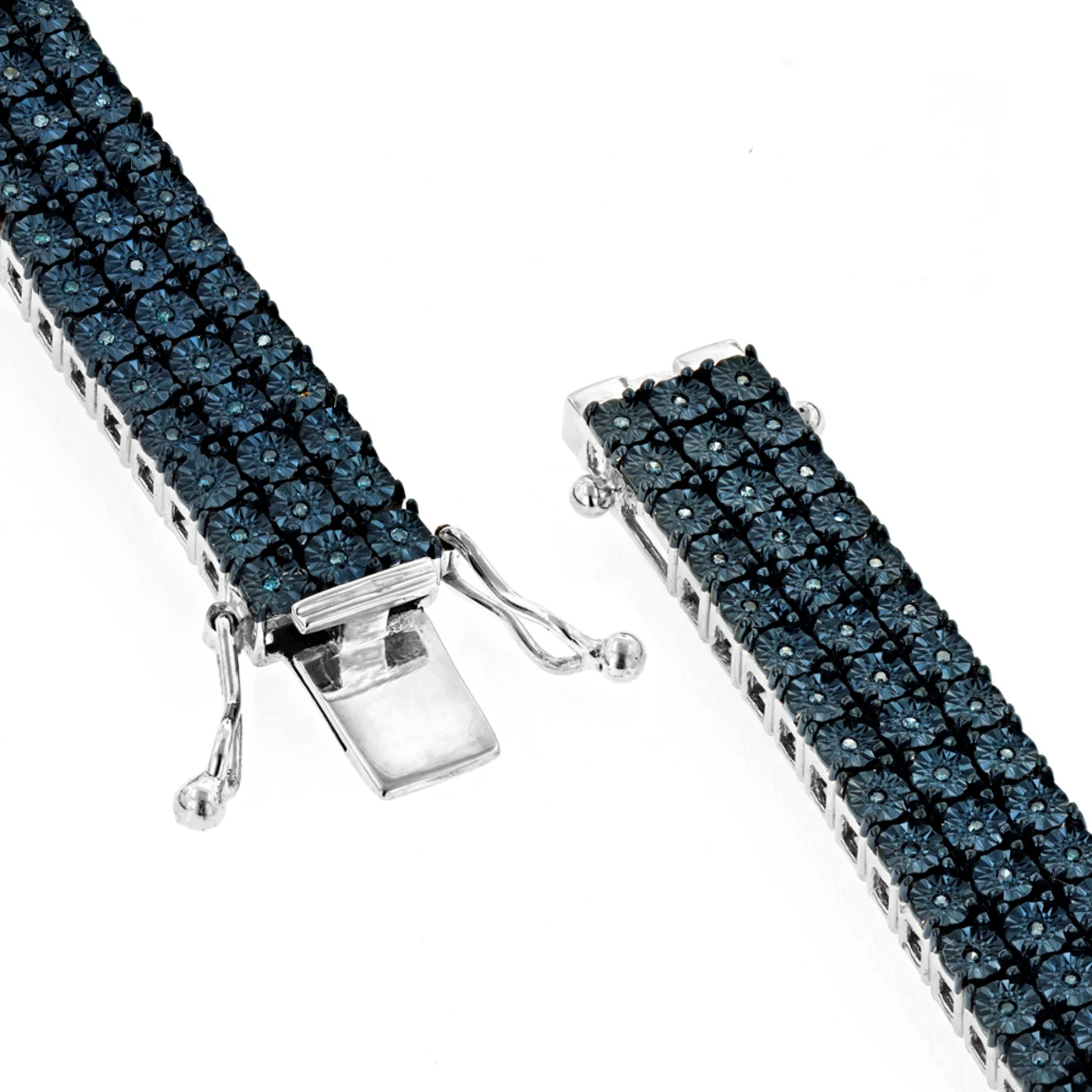 This White Blue Diamond Bracelet for Men in Sterling Silver weighs approximately 40 grams and showcases 0.5 carats of round diamonds. Featuring a trendy 2-tone design and a luxurious rhodium plating for extra shine, this silver diamond bracelet is an affordable alternative to gold jewelry.