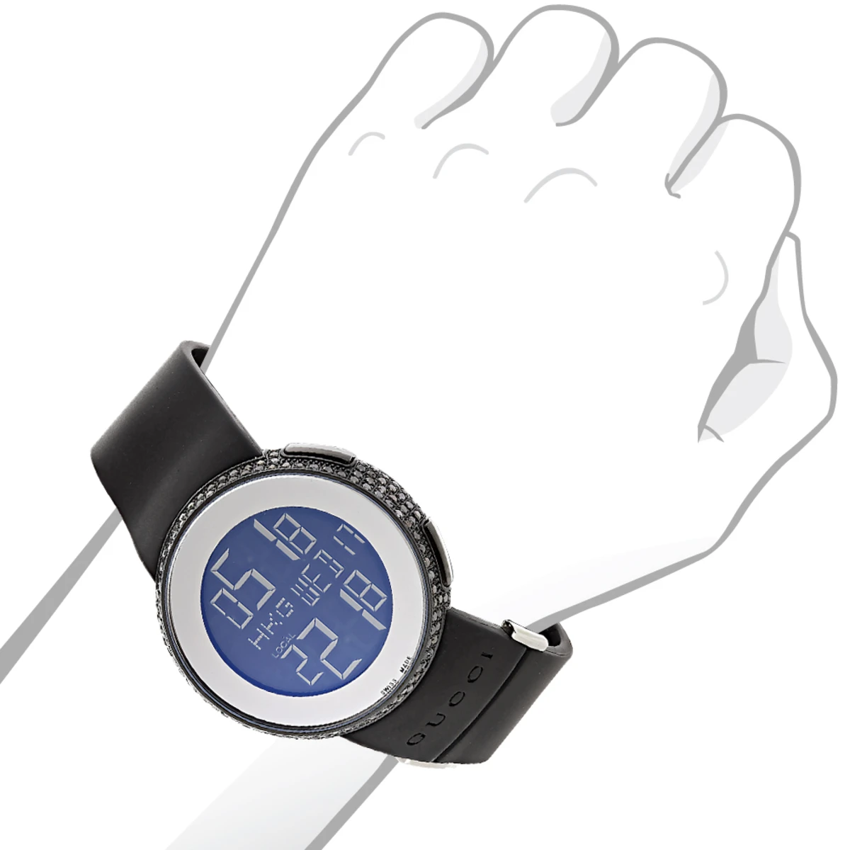 GUCCI Watches For Women! This custom Gucci Diamond Watch features 5.2 carats of sparkling black diamonds around the black stainless steel case, a scratch resistant sapphire crystal, a white rubber strap and a digital dial code. This ladies Gucci diamond watch showcases a fine Swiss-made movement; and is water-resistant to 30 m (100 ft).