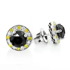 White Yellow And Black Diamond Stud Earrings 2.20ct 14K White Gold
